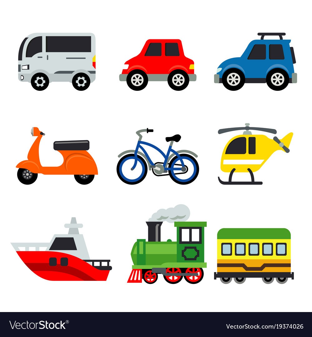 Bas, kereta, lori, kereta api, basikal, beca, motorsikal, kereta lembu, ambulan, van.
